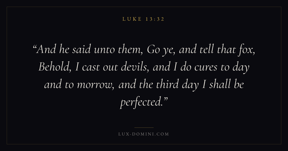 And he said unto them, Go ye, and tell that fox, Behold, I cast out devils, and I do cures to day and to morrow, and the third day I shall be perfected.