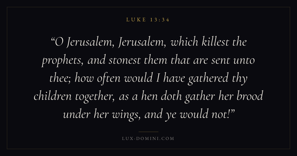 O Jerusalem, Jerusalem, which killest the prophets, and stonest them that are sent unto thee; how often would I have gathered thy children together, as a hen doth gather her brood under her wings, and ye would not!
