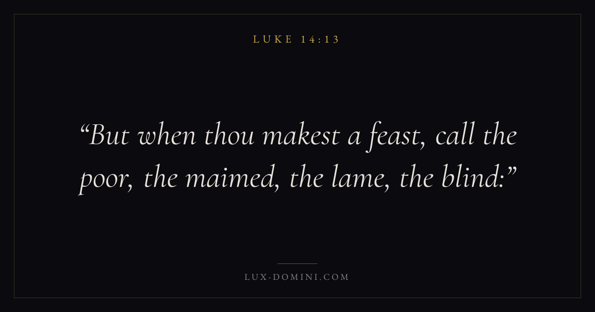 Books / Luke / Chapter 14 / Verse 13 ← Luke 14:12 Luke 14:13 Luke 14:14 → But when thou makest a feast, call the poor, the maimed, the lame, the blind: Download verse card Share on Twitter Share on Facebook Pin it ✦ Key themes PrayerJustice and mercySalvationHumilitySpirit Read with Luke 14:12Luke 14:14Matthew 6:9Luke 18:1 Related topics Bible verses about prayerBible verses about justice and mercyBible verses about salvationBible verses about humility ✦ Luke Chapter 14 verses V. 1 V. 2 V. 3 V. 4 V. 5 V. 6 V. 7 V. 8 V. 9 V. 10 V. 11 V. 12 V. 13 V. 14 V. 15 V. 16 V. 17 V. 18 V. 19 V. 20 V. 21 V. 22 V. 23 V. 24 V. 25 V. 26 V. 27 V. 28 V. 29 V. 30 V. 31 V. 32 V. 33 V. 34 V. 35