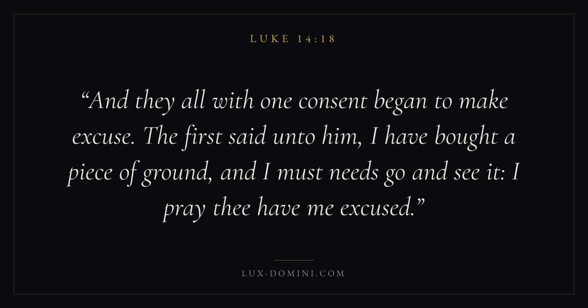 And they all with one consent began to make excuse. The first said unto him, I have bought a piece of ground, and I must needs go and see it: I pray thee have me excused.