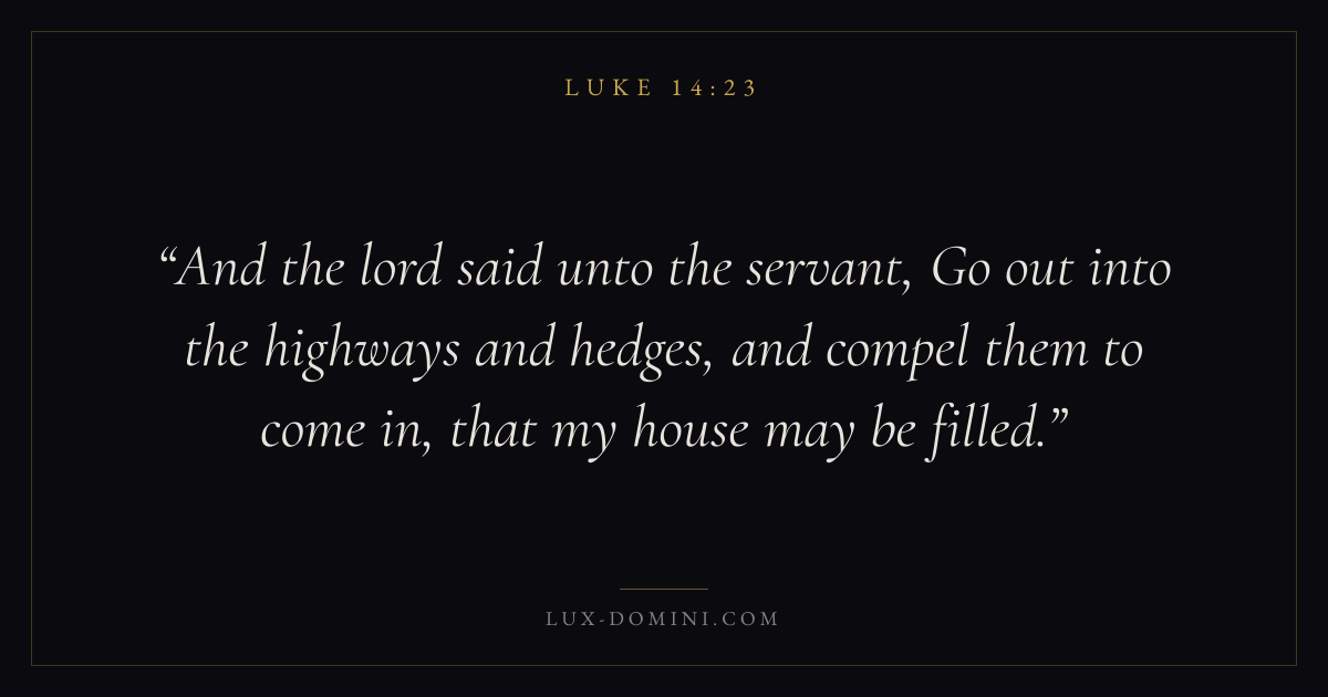 And the lord said unto the servant, Go out into the highways and hedges, and compel them to come in, that my house may be filled.