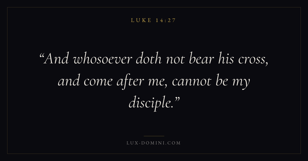 Books / Luke / Chapter 14 / Verse 27 ← Luke 14:26 Luke 14:27 Luke 14:28 → And whosoever doth not bear his cross, and come after me, cannot be my disciple. Download verse card Share on Twitter Share on Facebook Pin it ✦ Key themes PrayerJustice and mercySalvationSpirit Read with Luke 14:25Luke 14:26Matthew 6:9Luke 18:1 Related topics Bible verses about prayerBible verses about justice and mercyBible verses about salvation ✦ Luke Chapter 14 verses V. 1 V. 2 V. 3 V. 4 V. 5 V. 6 V. 7 V. 8 V. 9 V. 10 V. 11 V. 12 V. 13 V. 14 V. 15 V. 16 V. 17 V. 18 V. 19 V. 20 V. 21 V. 22 V. 23 V. 24 V. 25 V. 26 V. 27 V. 28 V. 29 V. 30 V. 31 V. 32 V. 33 V. 34 V. 35