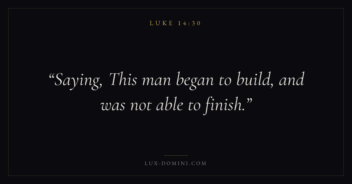 Books / Luke / Chapter 14 / Verse 30 ← Luke 14:29 Luke 14:30 Luke 14:31 → Saying, This man began to build, and was not able to finish. Download verse card Share on Twitter Share on Facebook Pin it ✦ Key themes PrayerJustice and mercySalvationSpirit Read with Luke 14:29Luke 14:31Matthew 6:9Luke 18:1 Related topics Bible verses about prayerBible verses about justice and mercyBible verses about salvation ✦ Luke Chapter 14 verses V. 1 V. 2 V. 3 V. 4 V. 5 V. 6 V. 7 V. 8 V. 9 V. 10 V. 11 V. 12 V. 13 V. 14 V. 15 V. 16 V. 17 V. 18 V. 19 V. 20 V. 21 V. 22 V. 23 V. 24 V. 25 V. 26 V. 27 V. 28 V. 29 V. 30 V. 31 V. 32 V. 33 V. 34 V. 35