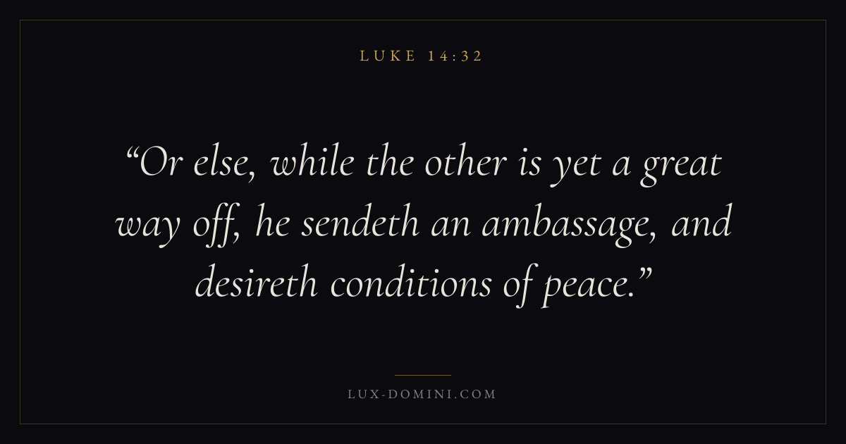 Or else, while the other is yet a great way off, he sendeth an ambassage, and desireth conditions of peace.