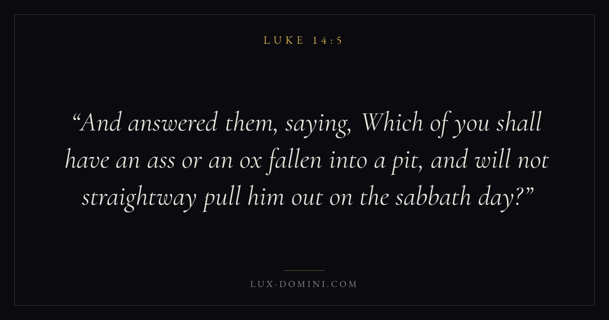 And answered them, saying, Which of you shall have an ass or an ox fallen into a pit, and will not straightway pull him out on the sabbath day?