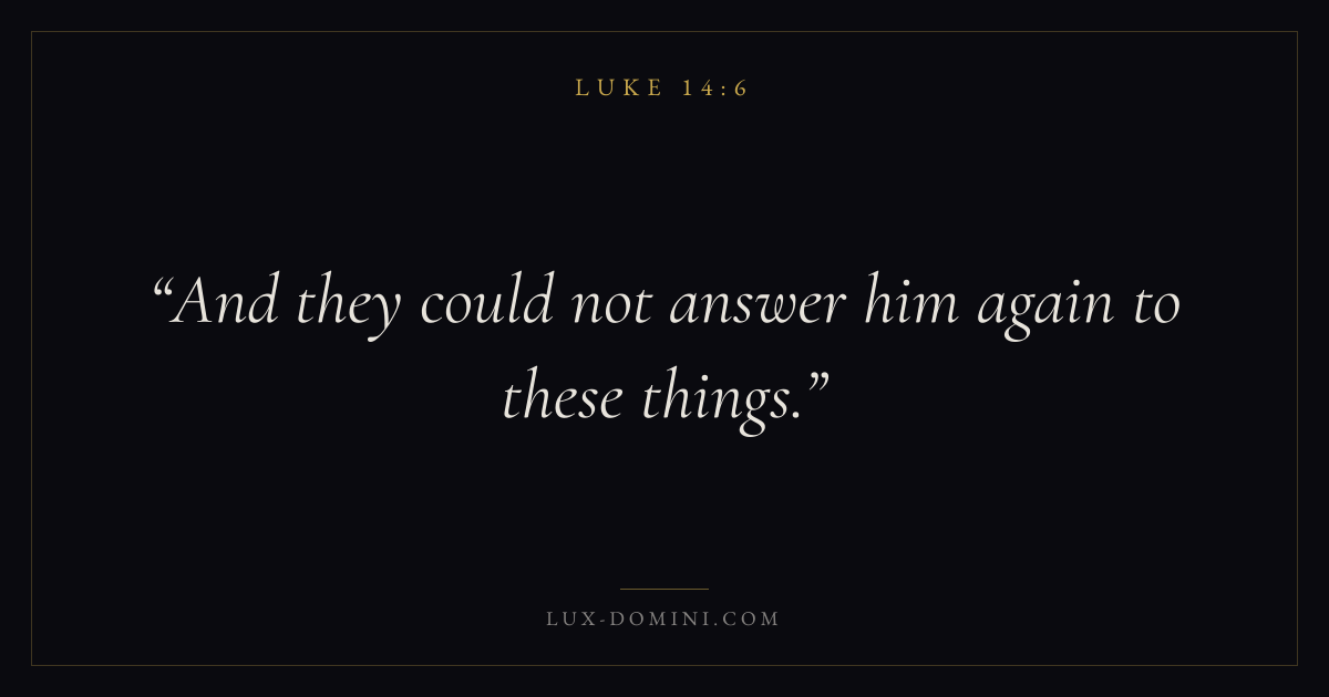 Books / Luke / Chapter 14 / Verse 6 ← Luke 14:5 Luke 14:6 Luke 14:7 → And they could not answer him again to these things. Download verse card Share on Twitter Share on Facebook Pin it ✦ Key themes PrayerJustice and mercySalvationSpirit Read with Matthew 6:9Luke 18:1Micah 6:8Amos 5:24 Related topics Bible verses about prayerBible verses about justice and mercyBible verses about salvation ✦ Luke Chapter 14 verses V. 1 V. 2 V. 3 V. 4 V. 5 V. 6 V. 7 V. 8 V. 9 V. 10 V. 11 V. 12 V. 13 V. 14 V. 15 V. 16 V. 17 V. 18 V. 19 V. 20 V. 21 V. 22 V. 23 V. 24 V. 25 V. 26 V. 27 V. 28 V. 29 V. 30 V. 31 V. 32 V. 33 V. 34 V. 35