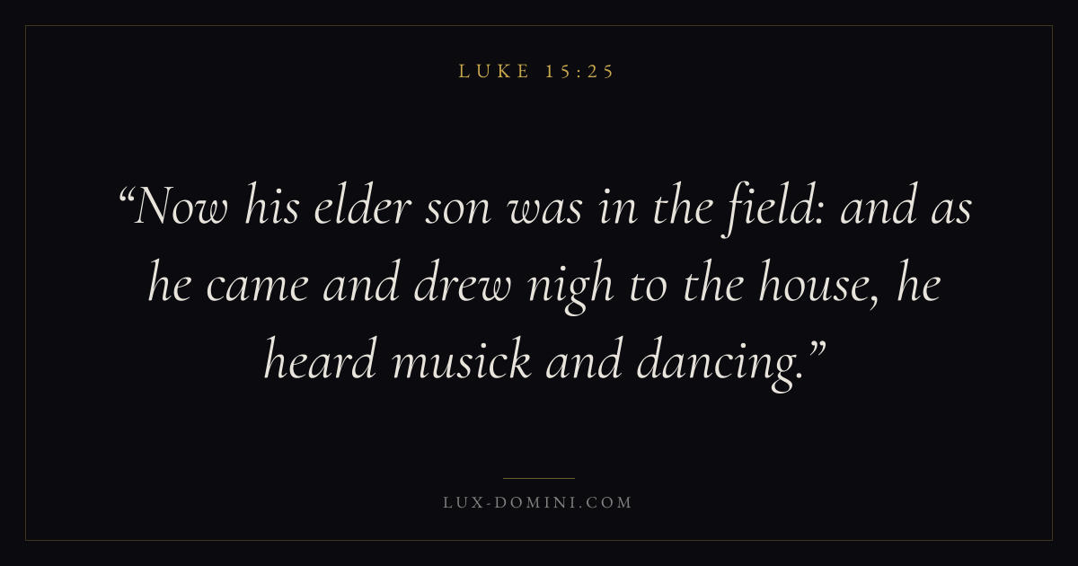 Now his elder son was in the field: and as he came and drew nigh to the house, he heard musick and dancing.