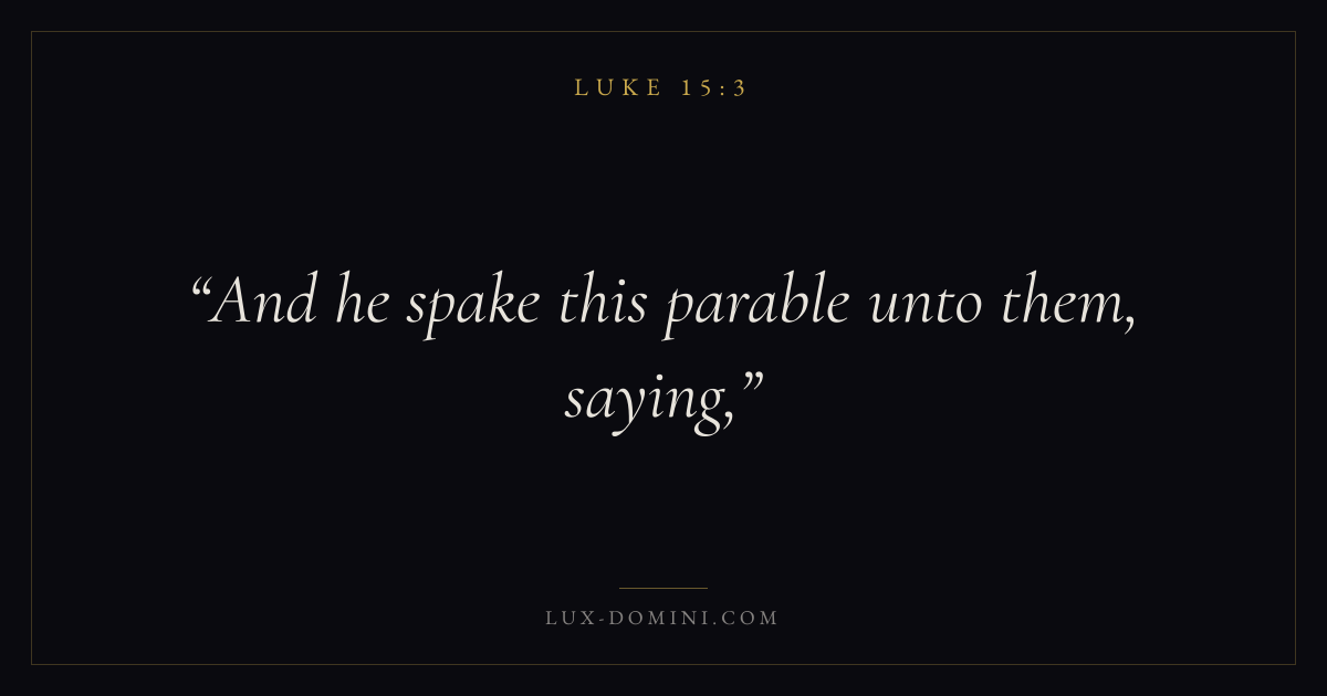 Books / Luke / Chapter 15 / Verse 3 ← Luke 15:2 Luke 15:3 Luke 15:4 → And he spake this parable unto them, saying, Download verse card Share on Twitter Share on Facebook Pin it ✦ Key themes PrayerJustice and mercySalvationSpirit Read with Luke 15:4Luke 15:5Matthew 6:9Luke 18:1 Related topics Bible verses about prayerBible verses about justice and mercyBible verses about salvation ✦ Luke Chapter 15 verses V. 1 V. 2 V. 3 V. 4 V. 5 V. 6 V. 7 V. 8 V. 9 V. 10 V. 11 V. 12 V. 13 V. 14 V. 15 V. 16 V. 17 V. 18 V. 19 V. 20 V. 21 V. 22 V. 23 V. 24 V. 25 V. 26 V. 27 V. 28 V. 29 V. 30 V. 31 V. 32