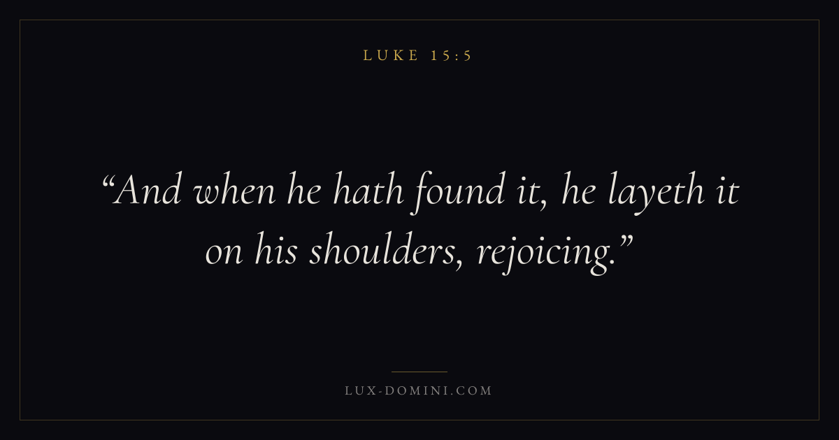Books / Luke / Chapter 15 / Verse 5 ← Luke 15:4 Luke 15:5 Luke 15:6 → And when he hath found it, he layeth it on his shoulders, rejoicing. Download verse card Share on Twitter Share on Facebook Pin it ✦ Key themes PrayerJustice and mercySalvationSpirit Read with Luke 15:3Luke 15:4Matthew 6:9Luke 18:1 Related topics Bible verses about prayerBible verses about justice and mercyBible verses about salvation ✦ Luke Chapter 15 verses V. 1 V. 2 V. 3 V. 4 V. 5 V. 6 V. 7 V. 8 V. 9 V. 10 V. 11 V. 12 V. 13 V. 14 V. 15 V. 16 V. 17 V. 18 V. 19 V. 20 V. 21 V. 22 V. 23 V. 24 V. 25 V. 26 V. 27 V. 28 V. 29 V. 30 V. 31 V. 32