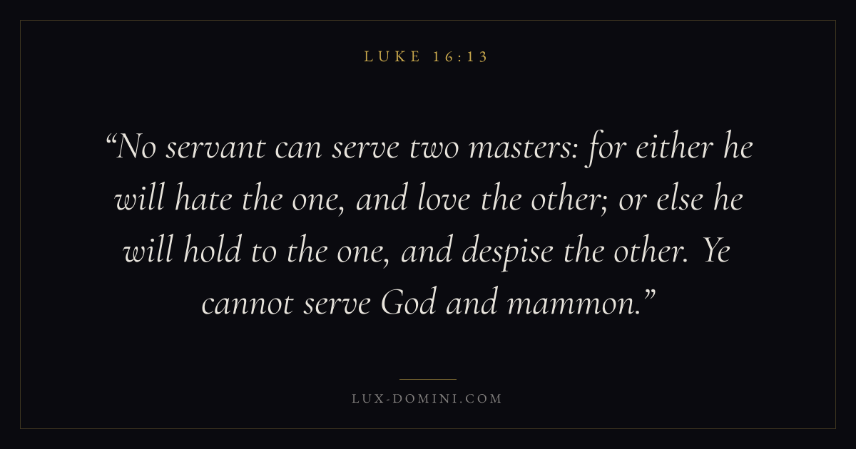 No servant can serve two masters: for either he will hate the one, and love the other; or else he will hold to the one, and despise the other. Ye cannot serve God and mammon.