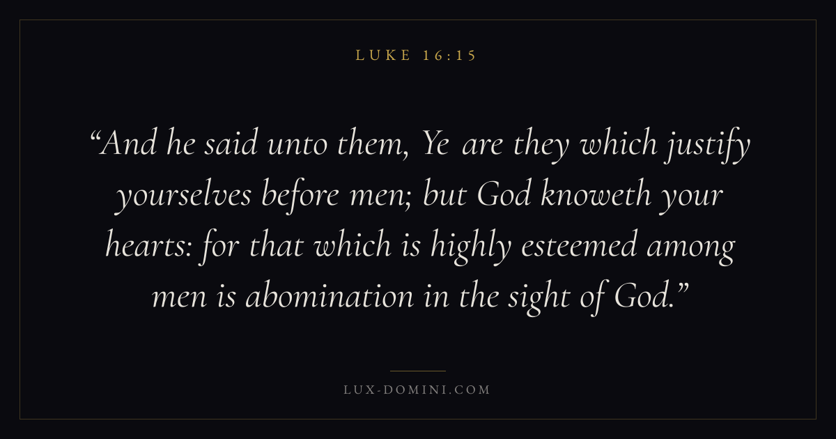 And he said unto them, Ye are they which justify yourselves before men; but God knoweth your hearts: for that which is highly esteemed among men is abomination in the sight of God.