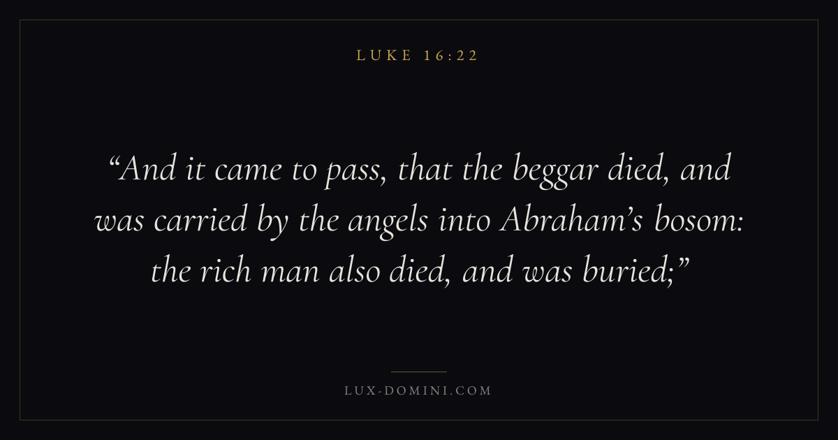 And it came to pass, that the beggar died, and was carried by the angels into Abraham’s bosom: the rich man also died, and was buried;