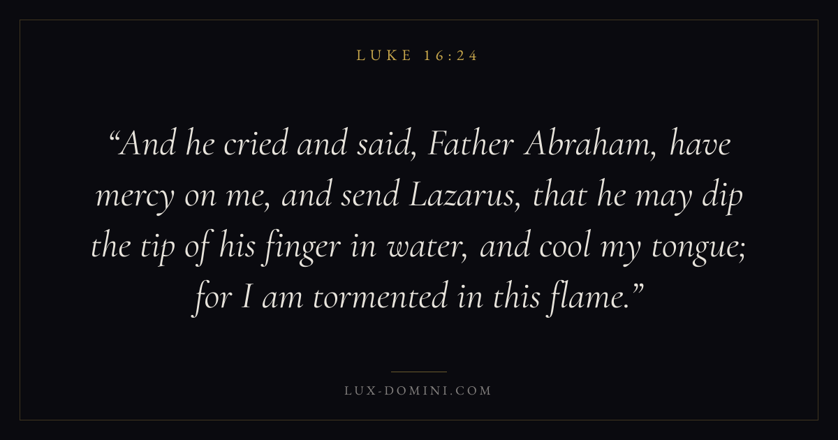 And he cried and said, Father Abraham, have mercy on me, and send Lazarus, that he may dip the tip of his finger in water, and cool my tongue; for I am tormented in this flame.