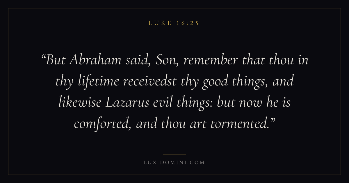 But Abraham said, Son, remember that thou in thy lifetime receivedst thy good things, and likewise Lazarus evil things: but now he is comforted, and thou art tormented.