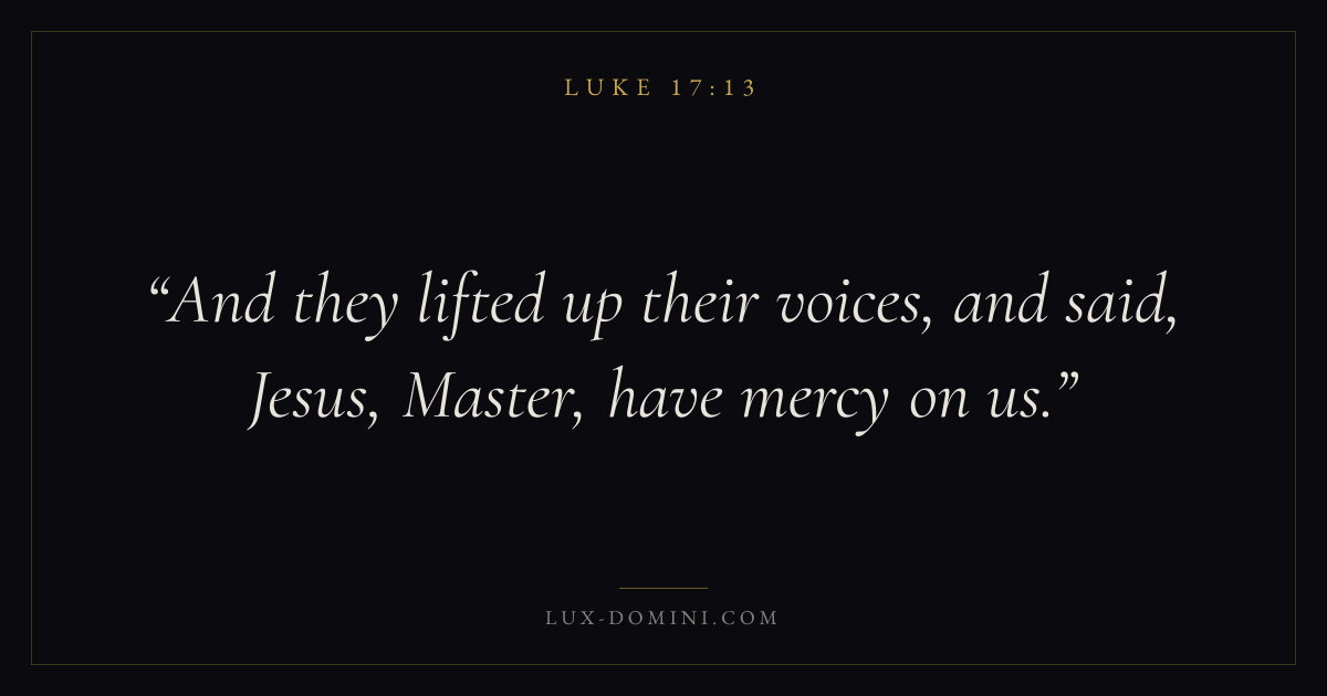 Books / Luke / Chapter 17 / Verse 13 ← Luke 17:12 Luke 17:13 Luke 17:14 → And they lifted up their voices, and said, Jesus, Master, have mercy on us. Download verse card Share on Twitter Share on Facebook Pin it ✦ Key themes PrayerJustice and mercySalvationHumilitySpirit Read with Luke 17:11Luke 17:12Matthew 6:9Luke 18:1 Related topics Bible verses about prayerBible verses about justice and mercyBible verses about salvationBible verses about humility ✦ Luke Chapter 17 verses V. 1 V. 2 V. 3 V. 4 V. 5 V. 6 V. 7 V. 8 V. 9 V. 10 V. 11 V. 12 V. 13 V. 14 V. 15 V. 16 V. 17 V. 18 V. 19 V. 20 V. 21 V. 22 V. 23 V. 24 V. 25 V. 26 V. 27 V. 28 V. 29 V. 30 V. 31 V. 32 V. 33 V. 34 V. 35 V. 36 V. 37