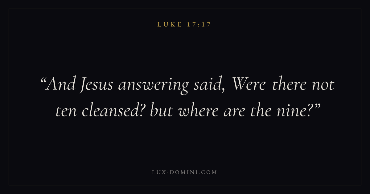 Books / Luke / Chapter 17 / Verse 17 ← Luke 17:16 Luke 17:17 Luke 17:18 → And Jesus answering said, Were there not ten cleansed? but where are the nine? Download verse card Share on Twitter Share on Facebook Pin it ✦ Key themes PrayerJustice and mercySalvationHumilitySpirit Read with Luke 17:16Matthew 6:9Luke 18:1Micah 6:8 Related topics Bible verses about prayerBible verses about justice and mercyBible verses about salvationBible verses about humility ✦ Luke Chapter 17 verses V. 1 V. 2 V. 3 V. 4 V. 5 V. 6 V. 7 V. 8 V. 9 V. 10 V. 11 V. 12 V. 13 V. 14 V. 15 V. 16 V. 17 V. 18 V. 19 V. 20 V. 21 V. 22 V. 23 V. 24 V. 25 V. 26 V. 27 V. 28 V. 29 V. 30 V. 31 V. 32 V. 33 V. 34 V. 35 V. 36 V. 37