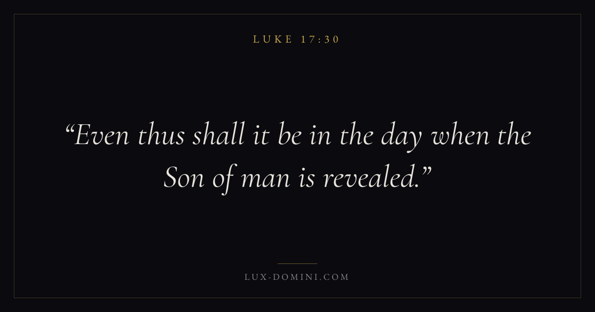 Books / Luke / Chapter 17 / Verse 30 ← Luke 17:29 Luke 17:30 Luke 17:31 → Even thus shall it be in the day when the Son of man is revealed. Download verse card Share on Twitter Share on Facebook Pin it ✦ Key themes PrayerJustice and mercySalvationGraceSpirit Read with Luke 17:31Matthew 6:9Luke 18:1Micah 6:8 Related topics Bible verses about prayerBible verses about justice and mercyBible verses about salvationBible verses about grace ✦ Luke Chapter 17 verses V. 1 V. 2 V. 3 V. 4 V. 5 V. 6 V. 7 V. 8 V. 9 V. 10 V. 11 V. 12 V. 13 V. 14 V. 15 V. 16 V. 17 V. 18 V. 19 V. 20 V. 21 V. 22 V. 23 V. 24 V. 25 V. 26 V. 27 V. 28 V. 29 V. 30 V. 31 V. 32 V. 33 V. 34 V. 35 V. 36 V. 37