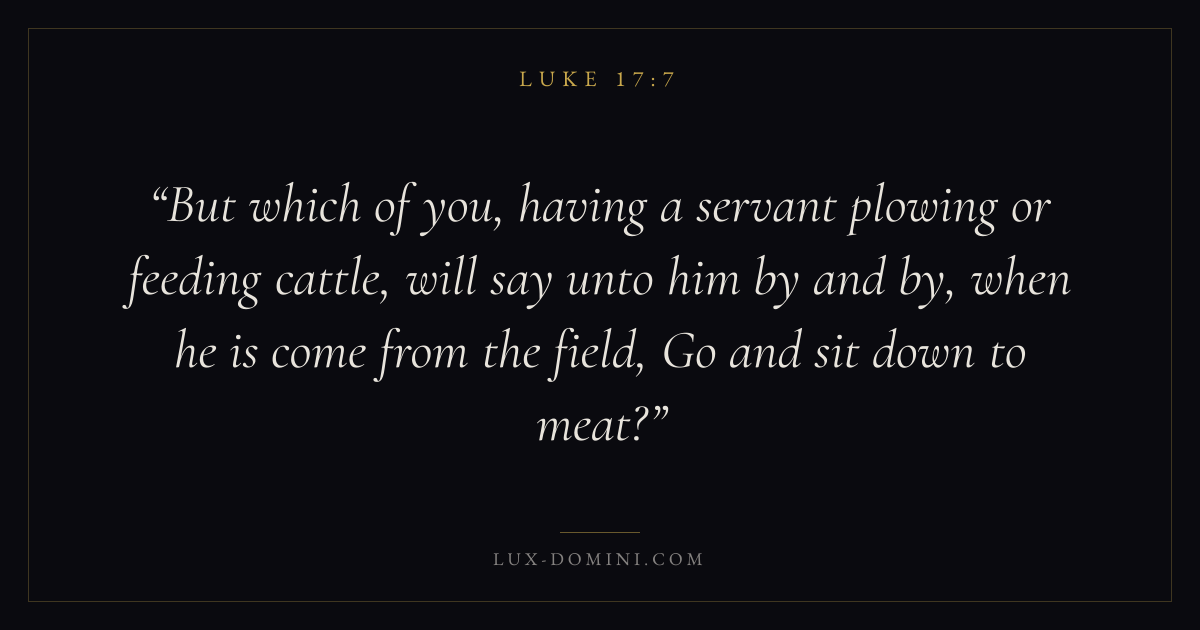 But which of you, having a servant plowing or feeding cattle, will say unto him by and by, when he is come from the field, Go and sit down to meat?