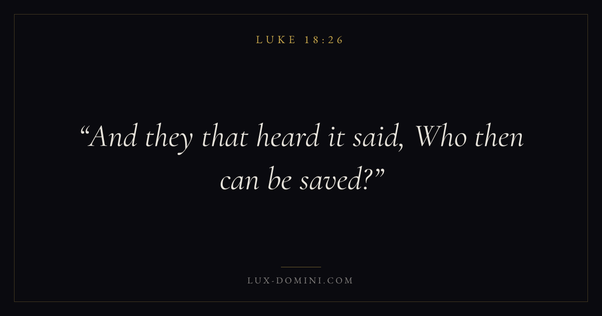 Books / Luke / Chapter 18 / Verse 26 ← Luke 18:25 Luke 18:26 Luke 18:27 → And they that heard it said, Who then can be saved? Download verse card Share on Twitter Share on Facebook Pin it ✦ Key themes PrayerJustice and mercySalvationSpirit Read with Luke 18:25Luke 18:27Matthew 6:9Luke 18:1 Related topics Bible verses about prayerBible verses about justice and mercyBible verses about salvation ✦ Luke Chapter 18 verses V. 1 V. 2 V. 3 V. 4 V. 5 V. 6 V. 7 V. 8 V. 9 V. 10 V. 11 V. 12 V. 13 V. 14 V. 15 V. 16 V. 17 V. 18 V. 19 V. 20 V. 21 V. 22 V. 23 V. 24 V. 25 V. 26 V. 27 V. 28 V. 29 V. 30 V. 31 V. 32 V. 33 V. 34 V. 35 V. 36 V. 37 V. 38 V. 39 V. 40 V. 41 V. 42 V. 43