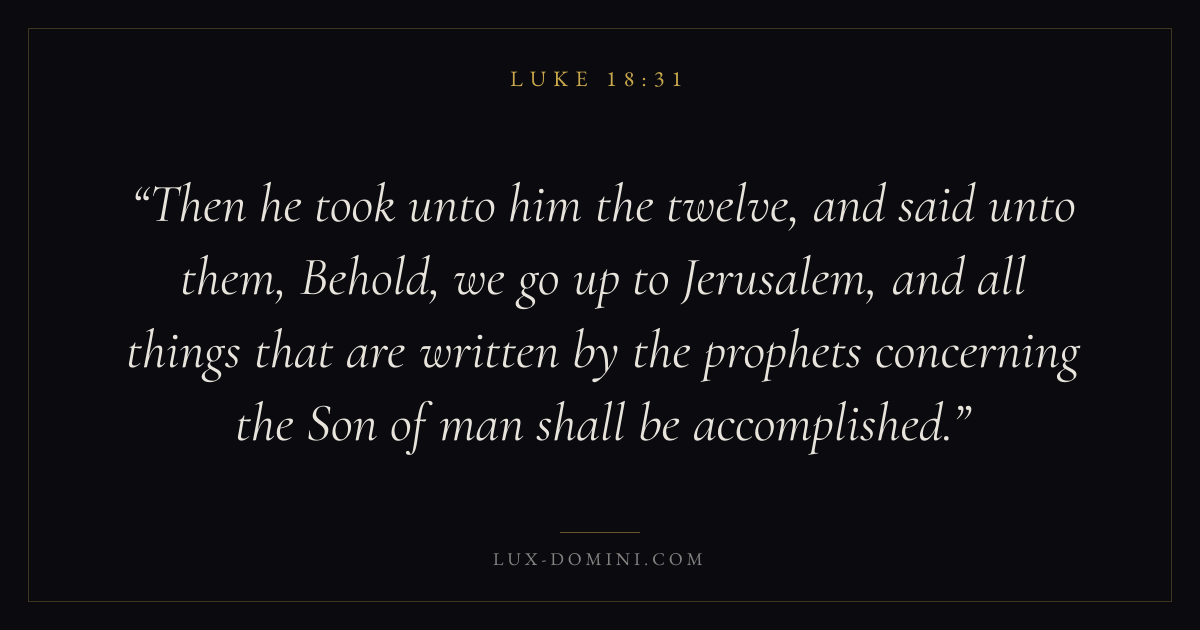 Then he took unto him the twelve, and said unto them, Behold, we go up to Jerusalem, and all things that are written by the prophets concerning the Son of man shall be accomplished.