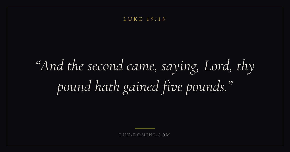 Books / Luke / Chapter 19 / Verse 18 ← Luke 19:17 Luke 19:18 Luke 19:19 → And the second came, saying, Lord, thy pound hath gained five pounds. Download verse card Share on Twitter Share on Facebook Pin it ✦ Key themes PrayerJustice and mercySalvationSpirit Read with Luke 19:17Luke 19:19Matthew 6:9Luke 18:1 Related topics Bible verses about prayerBible verses about justice and mercyBible verses about salvation ✦ Luke Chapter 19 verses V. 1 V. 2 V. 3 V. 4 V. 5 V. 6 V. 7 V. 8 V. 9 V. 10 V. 11 V. 12 V. 13 V. 14 V. 15 V. 16 V. 17 V. 18 V. 19 V. 20 V. 21 V. 22 V. 23 V. 24 V. 25 V. 26 V. 27 V. 28 V. 29 V. 30 V. 31 V. 32 V. 33 V. 34 V. 35 V. 36 V. 37 V. 38 V. 39 V. 40 V. 41 V. 42 V. 43 V. 44 V. 45 V. 46 V. 47 V. 48