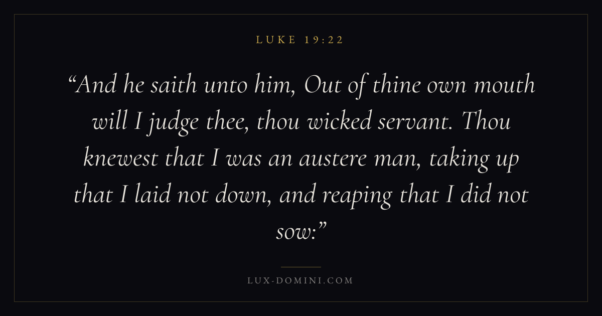 And he saith unto him, Out of thine own mouth will I judge thee, thou wicked servant. Thou knewest that I was an austere man, taking up that I laid not down, and reaping that I did not sow: