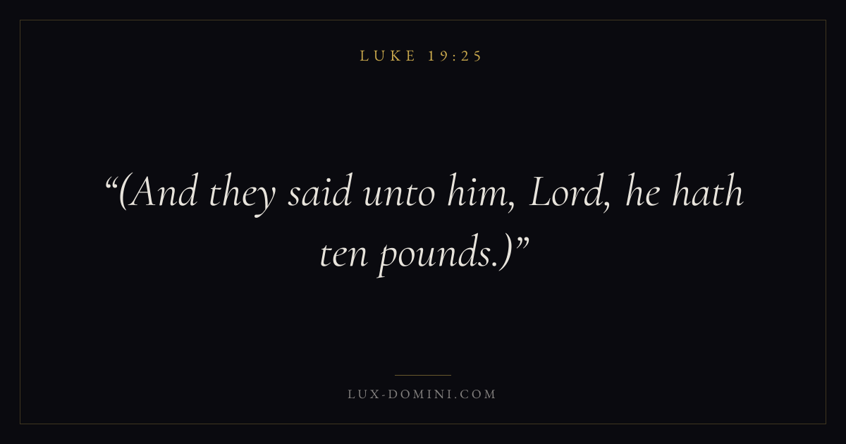 Books / Luke / Chapter 19 / Verse 25 ← Luke 19:24 Luke 19:25 Luke 19:26 → (And they said unto him, Lord, he hath ten pounds.) Download verse card Share on Twitter Share on Facebook Pin it ✦ Key themes PrayerJustice and mercySalvationSpirit Read with Luke 19:26Luke 19:27Matthew 6:9Luke 18:1 Related topics Bible verses about prayerBible verses about justice and mercyBible verses about salvation ✦ Luke Chapter 19 verses V. 1 V. 2 V. 3 V. 4 V. 5 V. 6 V. 7 V. 8 V. 9 V. 10 V. 11 V. 12 V. 13 V. 14 V. 15 V. 16 V. 17 V. 18 V. 19 V. 20 V. 21 V. 22 V. 23 V. 24 V. 25 V. 26 V. 27 V. 28 V. 29 V. 30 V. 31 V. 32 V. 33 V. 34 V. 35 V. 36 V. 37 V. 38 V. 39 V. 40 V. 41 V. 42 V. 43 V. 44 V. 45 V. 46 V. 47 V. 48