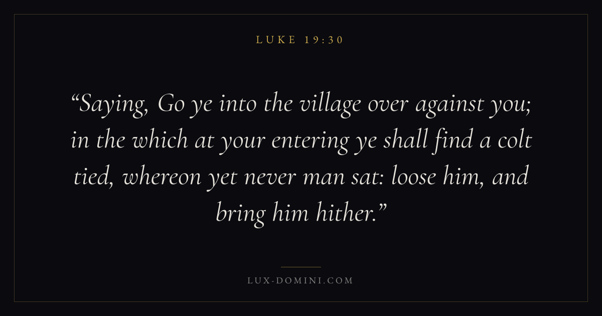 Saying, Go ye into the village over against you; in the which at your entering ye shall find a colt tied, whereon yet never man sat: loose him, and bring him hither.