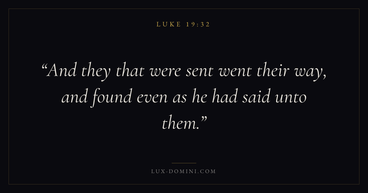 Books / Luke / Chapter 19 / Verse 32 ← Luke 19:31 Luke 19:32 Luke 19:33 → And they that were sent went their way, and found even as he had said unto them. Download verse card Share on Twitter Share on Facebook Pin it ✦ Key themes PrayerJustice and mercySalvationSpirit Read with Luke 19:28Luke 19:29Matthew 6:9Luke 18:1 Related topics Bible verses about prayerBible verses about justice and mercyBible verses about salvation ✦ Luke Chapter 19 verses V. 1 V. 2 V. 3 V. 4 V. 5 V. 6 V. 7 V. 8 V. 9 V. 10 V. 11 V. 12 V. 13 V. 14 V. 15 V. 16 V. 17 V. 18 V. 19 V. 20 V. 21 V. 22 V. 23 V. 24 V. 25 V. 26 V. 27 V. 28 V. 29 V. 30 V. 31 V. 32 V. 33 V. 34 V. 35 V. 36 V. 37 V. 38 V. 39 V. 40 V. 41 V. 42 V. 43 V. 44 V. 45 V. 46 V. 47 V. 48