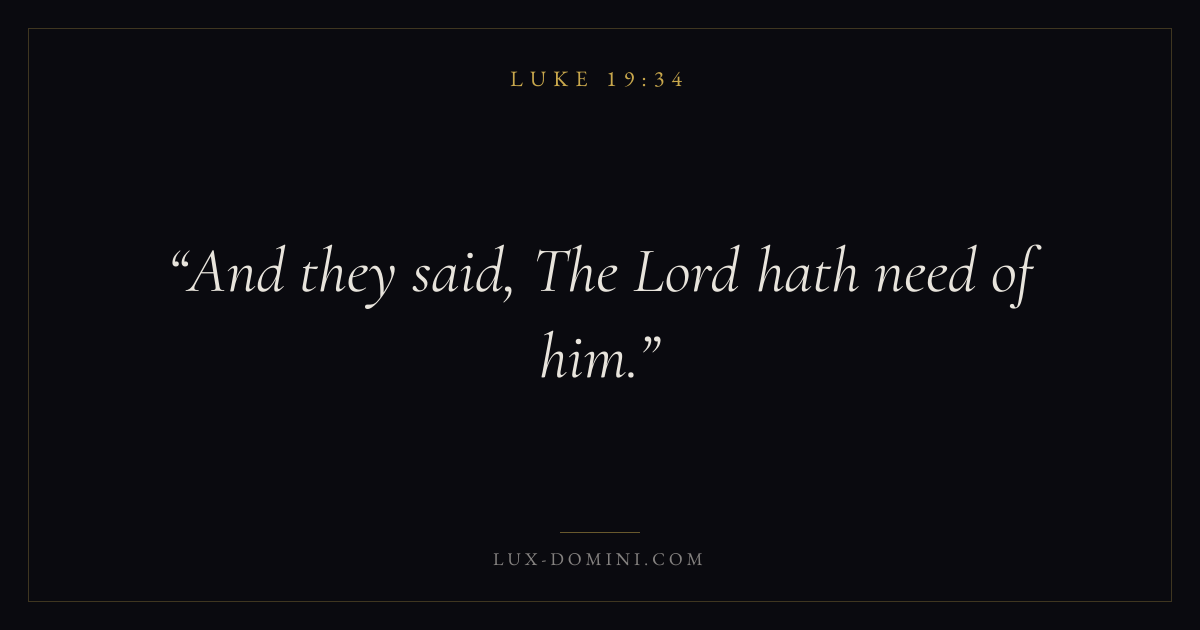 Books / Luke / Chapter 19 / Verse 34 ← Luke 19:33 Luke 19:34 Luke 19:35 → And they said, The Lord hath need of him. Download verse card Share on Twitter Share on Facebook Pin it ✦ Key themes PrayerJustice and mercySalvationSpirit Read with Luke 19:33Luke 19:35Matthew 6:9Luke 18:1 Related topics Bible verses about prayerBible verses about justice and mercyBible verses about salvation ✦ Luke Chapter 19 verses V. 1 V. 2 V. 3 V. 4 V. 5 V. 6 V. 7 V. 8 V. 9 V. 10 V. 11 V. 12 V. 13 V. 14 V. 15 V. 16 V. 17 V. 18 V. 19 V. 20 V. 21 V. 22 V. 23 V. 24 V. 25 V. 26 V. 27 V. 28 V. 29 V. 30 V. 31 V. 32 V. 33 V. 34 V. 35 V. 36 V. 37 V. 38 V. 39 V. 40 V. 41 V. 42 V. 43 V. 44 V. 45 V. 46 V. 47 V. 48