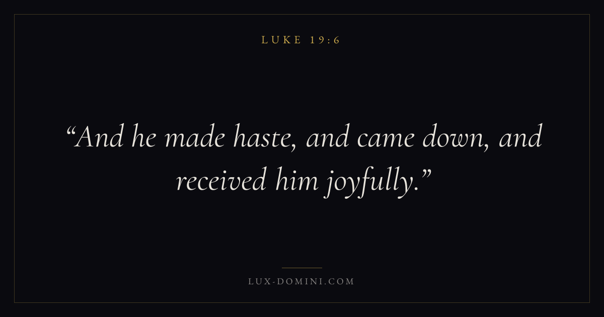 Books / Luke / Chapter 19 / Verse 6 ← Luke 19:5 Luke 19:6 Luke 19:7 → And he made haste, and came down, and received him joyfully. Download verse card Share on Twitter Share on Facebook Pin it ✦ Key themes PrayerJustice and mercySalvationSpirit Read with Luke 19:7Luke 19:8Matthew 6:9Luke 18:1 Related topics Bible verses about prayerBible verses about justice and mercyBible verses about salvation ✦ Luke Chapter 19 verses V. 1 V. 2 V. 3 V. 4 V. 5 V. 6 V. 7 V. 8 V. 9 V. 10 V. 11 V. 12 V. 13 V. 14 V. 15 V. 16 V. 17 V. 18 V. 19 V. 20 V. 21 V. 22 V. 23 V. 24 V. 25 V. 26 V. 27 V. 28 V. 29 V. 30 V. 31 V. 32 V. 33 V. 34 V. 35 V. 36 V. 37 V. 38 V. 39 V. 40 V. 41 V. 42 V. 43 V. 44 V. 45 V. 46 V. 47 V. 48