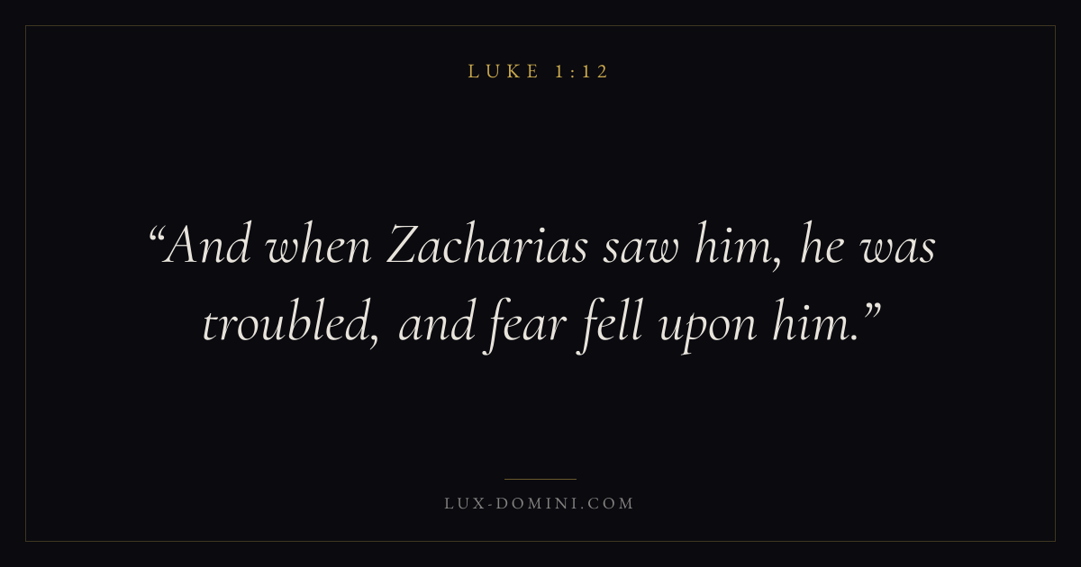 Books / Luke / Chapter 1 / Verse 12 ← Luke 1:11 Luke 1:12 Luke 1:13 → And when Zacharias saw him, he was troubled, and fear fell upon him. Download verse card Share on Twitter Share on Facebook Pin it ✦ Key themes Anxiety and fearPrayerJustice and mercySalvationSpirit Read with Luke 1:10Luke 1:11Philippians 4:6Isaiah 41:10 Related topics Bible verses about anxiety and fearBible verses about prayerBible verses about justice and mercyBible verses about salvation ✦ Luke Chapter 1 verses V. 1 V. 2 V. 3 V. 4 V. 5 V. 6 V. 7 V. 8 V. 9 V. 10 V. 11 V. 12 V. 13 V. 14 V. 15 V. 16 V. 17 V. 18 V. 19 V. 20 V. 21 V. 22 V. 23 V. 24 V. 25 V. 26 V. 27 V. 28 V. 29 V. 30 V. 31 V. 32 V. 33 V. 34 V. 35 V. 36 V. 37 V. 38 V. 39 V. 40 V. 41 V. 42 V. 43 V. 44 V. 45 V. 46 V. 47 V. 48 V. 49 V. 50 V. 51 V. 52 V. 53 V. 54 V. 55 V. 56 V. 57 V. 58 V. 59 V. 60 V. 61 V. 62 V. 63 V. 64 V. 65 V. 66 V. 67 V. 68 V. 69 V. 70 V. 71 V. 72 V. 73 V. 74 V. 75 V. 76 V. 77 V. 78 V. 79 V. 80