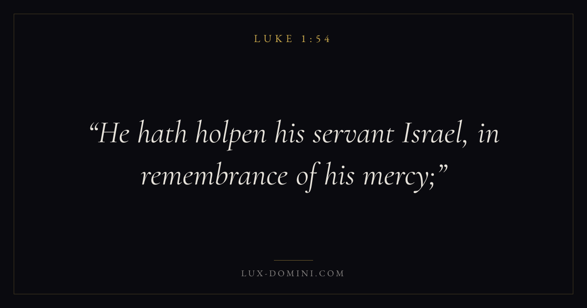 Books / Luke / Chapter 1 / Verse 54 ← Luke 1:53 Luke 1:54 Luke 1:55 → He hath holpen his servant Israel, in remembrance of his mercy; Download verse card Share on Twitter Share on Facebook Pin it ✦ Key themes PrayerJustice and mercySalvationGraceSpirit Read with Luke 1:55Luke 1:56Matthew 6:9Luke 18:1 Related topics Bible verses about prayerBible verses about justice and mercyBible verses about salvationBible verses about grace ✦ Luke Chapter 1 verses V. 1 V. 2 V. 3 V. 4 V. 5 V. 6 V. 7 V. 8 V. 9 V. 10 V. 11 V. 12 V. 13 V. 14 V. 15 V. 16 V. 17 V. 18 V. 19 V. 20 V. 21 V. 22 V. 23 V. 24 V. 25 V. 26 V. 27 V. 28 V. 29 V. 30 V. 31 V. 32 V. 33 V. 34 V. 35 V. 36 V. 37 V. 38 V. 39 V. 40 V. 41 V. 42 V. 43 V. 44 V. 45 V. 46 V. 47 V. 48 V. 49 V. 50 V. 51 V. 52 V. 53 V. 54 V. 55 V. 56 V. 57 V. 58 V. 59 V. 60 V. 61 V. 62 V. 63 V. 64 V. 65 V. 66 V. 67 V. 68 V. 69 V. 70 V. 71 V. 72 V. 73 V. 74 V. 75 V. 76 V. 77 V. 78 V. 79 V. 80
