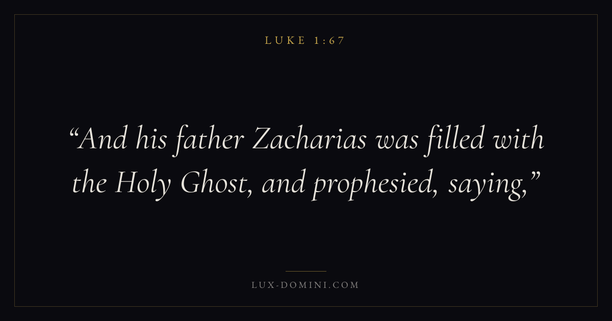 Books / Luke / Chapter 1 / Verse 67 ← Luke 1:66 Luke 1:67 Luke 1:68 → And his father Zacharias was filled with the Holy Ghost, and prophesied, saying, Download verse card Share on Twitter Share on Facebook Pin it ✦ Key themes PrayerJustice and mercySalvationSpirit Read with Luke 1:64Luke 1:65Matthew 6:9Luke 18:1 Related topics Bible verses about prayerBible verses about justice and mercyBible verses about salvation ✦ Luke Chapter 1 verses V. 1 V. 2 V. 3 V. 4 V. 5 V. 6 V. 7 V. 8 V. 9 V. 10 V. 11 V. 12 V. 13 V. 14 V. 15 V. 16 V. 17 V. 18 V. 19 V. 20 V. 21 V. 22 V. 23 V. 24 V. 25 V. 26 V. 27 V. 28 V. 29 V. 30 V. 31 V. 32 V. 33 V. 34 V. 35 V. 36 V. 37 V. 38 V. 39 V. 40 V. 41 V. 42 V. 43 V. 44 V. 45 V. 46 V. 47 V. 48 V. 49 V. 50 V. 51 V. 52 V. 53 V. 54 V. 55 V. 56 V. 57 V. 58 V. 59 V. 60 V. 61 V. 62 V. 63 V. 64 V. 65 V. 66 V. 67 V. 68 V. 69 V. 70 V. 71 V. 72 V. 73 V. 74 V. 75 V. 76 V. 77 V. 78 V. 79 V. 80