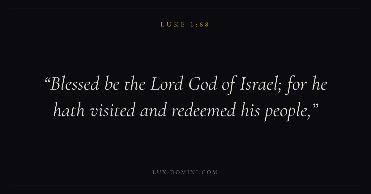 Books / Luke / Chapter 1 / Verse 68 ← Luke 1:67 Luke 1:68 Luke 1:69 → Blessed be the Lord God of Israel; for he hath visited and redeemed his people, Download verse card Share on Twitter Share on Facebook Pin it ✦ Key themes PrayerJustice and mercySalvationSpirit Read with Luke 1:64Luke 1:65Matthew 6:9Luke 18:1 Related topics Bible verses about prayerBible verses about justice and mercyBible verses about salvation ✦ Luke Chapter 1 verses V. 1 V. 2 V. 3 V. 4 V. 5 V. 6 V. 7 V. 8 V. 9 V. 10 V. 11 V. 12 V. 13 V. 14 V. 15 V. 16 V. 17 V. 18 V. 19 V. 20 V. 21 V. 22 V. 23 V. 24 V. 25 V. 26 V. 27 V. 28 V. 29 V. 30 V. 31 V. 32 V. 33 V. 34 V. 35 V. 36 V. 37 V. 38 V. 39 V. 40 V. 41 V. 42 V. 43 V. 44 V. 45 V. 46 V. 47 V. 48 V. 49 V. 50 V. 51 V. 52 V. 53 V. 54 V. 55 V. 56 V. 57 V. 58 V. 59 V. 60 V. 61 V. 62 V. 63 V. 64 V. 65 V. 66 V. 67 V. 68 V. 69 V. 70 V. 71 V. 72 V. 73 V. 74 V. 75 V. 76 V. 77 V. 78 V. 79 V. 80