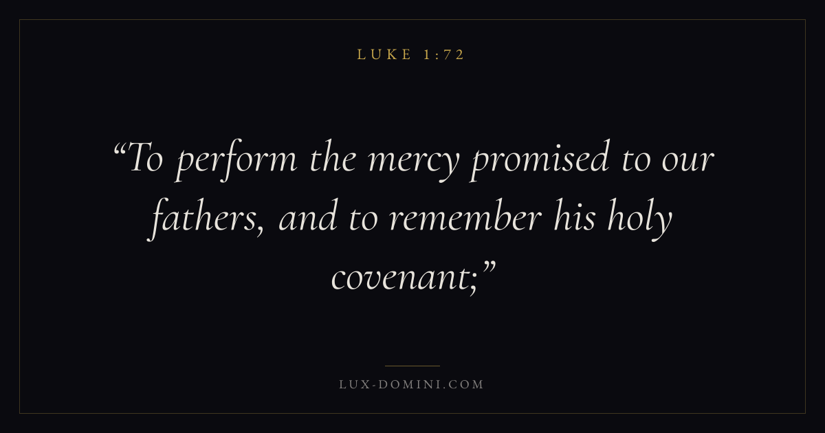 Books / Luke / Chapter 1 / Verse 72 ← Luke 1:71 Luke 1:72 Luke 1:73 → To perform the mercy promised to our fathers, and to remember his holy covenant; Download verse card Share on Twitter Share on Facebook Pin it ✦ Key themes HopePrayerJustice and mercySalvationSpirit Read with Luke 1:69Luke 1:70Romans 8:24Revelation 21:4 Related topics Bible verses about hopeBible verses about prayerBible verses about justice and mercyBible verses about salvation ✦ Luke Chapter 1 verses V. 1 V. 2 V. 3 V. 4 V. 5 V. 6 V. 7 V. 8 V. 9 V. 10 V. 11 V. 12 V. 13 V. 14 V. 15 V. 16 V. 17 V. 18 V. 19 V. 20 V. 21 V. 22 V. 23 V. 24 V. 25 V. 26 V. 27 V. 28 V. 29 V. 30 V. 31 V. 32 V. 33 V. 34 V. 35 V. 36 V. 37 V. 38 V. 39 V. 40 V. 41 V. 42 V. 43 V. 44 V. 45 V. 46 V. 47 V. 48 V. 49 V. 50 V. 51 V. 52 V. 53 V. 54 V. 55 V. 56 V. 57 V. 58 V. 59 V. 60 V. 61 V. 62 V. 63 V. 64 V. 65 V. 66 V. 67 V. 68 V. 69 V. 70 V. 71 V. 72 V. 73 V. 74 V. 75 V. 76 V. 77 V. 78 V. 79 V. 80