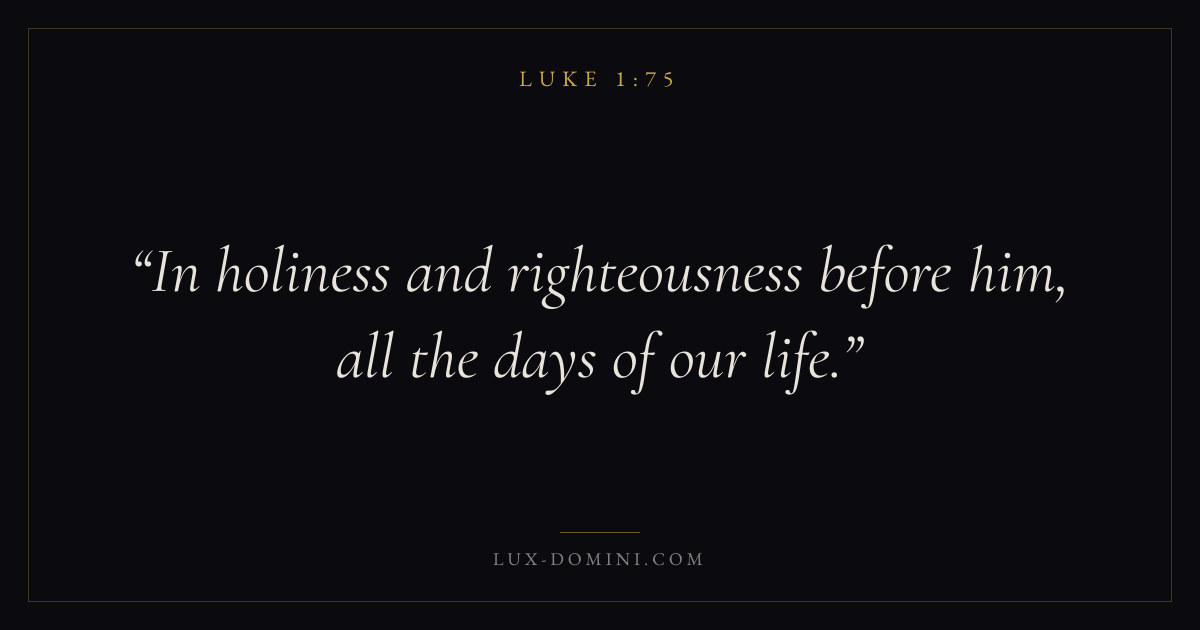 Books / Luke / Chapter 1 / Verse 75 ← Luke 1:74 Luke 1:75 Luke 1:76 → In holiness and righteousness before him, all the days of our life. Download verse card Share on Twitter Share on Facebook Pin it ✦ Key themes PrayerJustice and mercySalvationSpirit Read with Luke 1:74Luke 1:76Matthew 6:9Luke 18:1 Related topics Bible verses about prayerBible verses about justice and mercyBible verses about salvation ✦ Luke Chapter 1 verses V. 1 V. 2 V. 3 V. 4 V. 5 V. 6 V. 7 V. 8 V. 9 V. 10 V. 11 V. 12 V. 13 V. 14 V. 15 V. 16 V. 17 V. 18 V. 19 V. 20 V. 21 V. 22 V. 23 V. 24 V. 25 V. 26 V. 27 V. 28 V. 29 V. 30 V. 31 V. 32 V. 33 V. 34 V. 35 V. 36 V. 37 V. 38 V. 39 V. 40 V. 41 V. 42 V. 43 V. 44 V. 45 V. 46 V. 47 V. 48 V. 49 V. 50 V. 51 V. 52 V. 53 V. 54 V. 55 V. 56 V. 57 V. 58 V. 59 V. 60 V. 61 V. 62 V. 63 V. 64 V. 65 V. 66 V. 67 V. 68 V. 69 V. 70 V. 71 V. 72 V. 73 V. 74 V. 75 V. 76 V. 77 V. 78 V. 79 V. 80