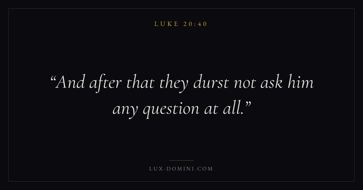 Books / Luke / Chapter 20 / Verse 40 ← Luke 20:39 Luke 20:40 Luke 20:41 → And after that they durst not ask him any question at all. Download verse card Share on Twitter Share on Facebook Pin it ✦ Key themes PrayerJustice and mercySalvationSpirit Read with Luke 20:39Luke 20:41Matthew 6:9Luke 18:1 Related topics Bible verses about prayerBible verses about justice and mercyBible verses about salvation ✦ Luke Chapter 20 verses V. 1 V. 2 V. 3 V. 4 V. 5 V. 6 V. 7 V. 8 V. 9 V. 10 V. 11 V. 12 V. 13 V. 14 V. 15 V. 16 V. 17 V. 18 V. 19 V. 20 V. 21 V. 22 V. 23 V. 24 V. 25 V. 26 V. 27 V. 28 V. 29 V. 30 V. 31 V. 32 V. 33 V. 34 V. 35 V. 36 V. 37 V. 38 V. 39 V. 40 V. 41 V. 42 V. 43 V. 44 V. 45 V. 46 V. 47