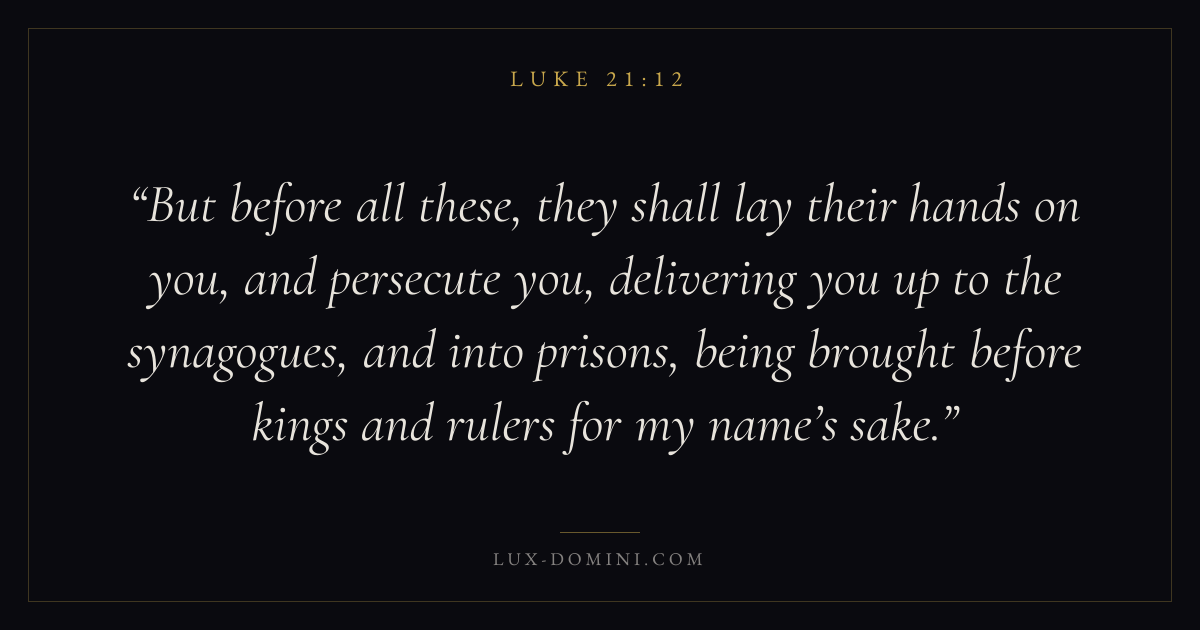 But before all these, they shall lay their hands on you, and persecute you, delivering you up to the synagogues, and into prisons, being brought before kings and rulers for my name’s sake.