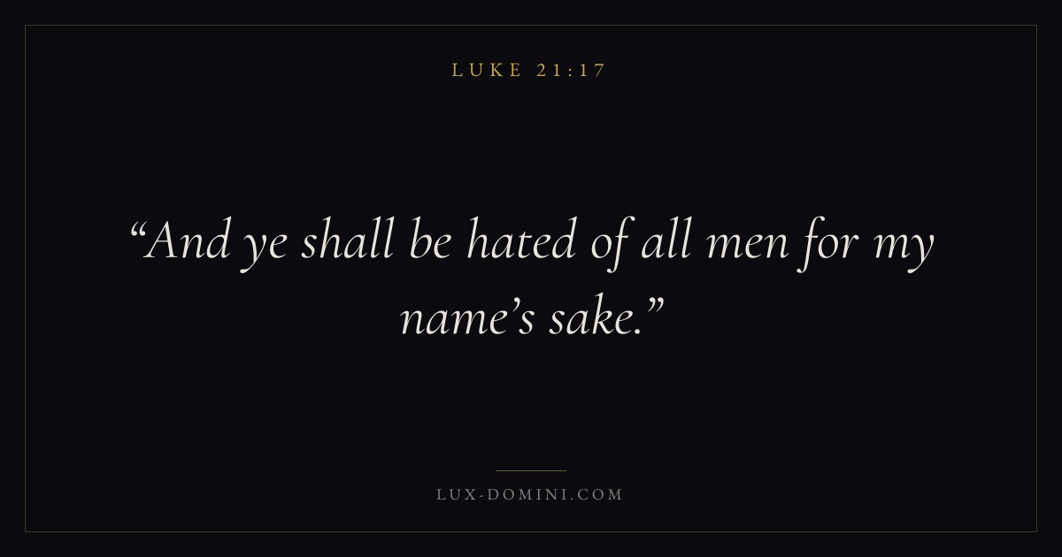 Books / Luke / Chapter 21 / Verse 17 ← Luke 21:16 Luke 21:17 Luke 21:18 → And ye shall be hated of all men for my name’s sake. Download verse card Share on Twitter Share on Facebook Pin it ✦ Key themes PrayerWisdomJustice and mercySalvationSpirit Read with Luke 21:14Luke 21:15Matthew 6:9Luke 18:1 Related topics Bible verses about prayerBible verses about wisdomBible verses about justice and mercyBible verses about salvation ✦ Luke Chapter 21 verses V. 1 V. 2 V. 3 V. 4 V. 5 V. 6 V. 7 V. 8 V. 9 V. 10 V. 11 V. 12 V. 13 V. 14 V. 15 V. 16 V. 17 V. 18 V. 19 V. 20 V. 21 V. 22 V. 23 V. 24 V. 25 V. 26 V. 27 V. 28 V. 29 V. 30 V. 31 V. 32 V. 33 V. 34 V. 35 V. 36 V. 37 V. 38