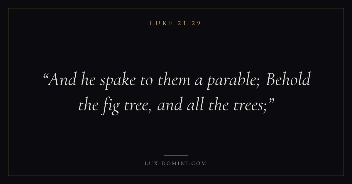 Books / Luke / Chapter 21 / Verse 29 ← Luke 21:28 Luke 21:29 Luke 21:30 → And he spake to them a parable; Behold the fig tree, and all the trees; Download verse card Share on Twitter Share on Facebook Pin it ✦ Key themes PrayerJustice and mercySalvationSpirit Read with Luke 21:25Luke 21:26Matthew 6:9Luke 18:1 Related topics Bible verses about prayerBible verses about justice and mercyBible verses about salvation ✦ Luke Chapter 21 verses V. 1 V. 2 V. 3 V. 4 V. 5 V. 6 V. 7 V. 8 V. 9 V. 10 V. 11 V. 12 V. 13 V. 14 V. 15 V. 16 V. 17 V. 18 V. 19 V. 20 V. 21 V. 22 V. 23 V. 24 V. 25 V. 26 V. 27 V. 28 V. 29 V. 30 V. 31 V. 32 V. 33 V. 34 V. 35 V. 36 V. 37 V. 38
