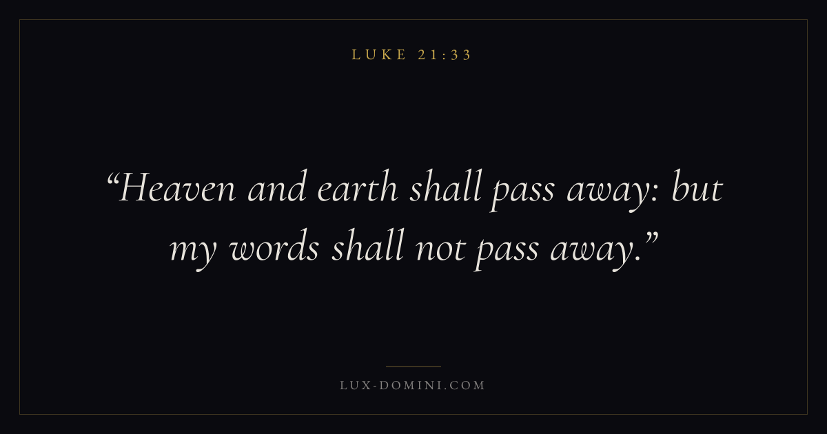 Books / Luke / Chapter 21 / Verse 33 ← Luke 21:32 Luke 21:33 Luke 21:34 → Heaven and earth shall pass away: but my words shall not pass away. Download verse card Share on Twitter Share on Facebook Pin it ✦ Key themes PrayerJustice and mercySalvationSpirit Read with Luke 21:32Matthew 6:9Luke 18:1Micah 6:8 Related topics Bible verses about prayerBible verses about justice and mercyBible verses about salvation ✦ Luke Chapter 21 verses V. 1 V. 2 V. 3 V. 4 V. 5 V. 6 V. 7 V. 8 V. 9 V. 10 V. 11 V. 12 V. 13 V. 14 V. 15 V. 16 V. 17 V. 18 V. 19 V. 20 V. 21 V. 22 V. 23 V. 24 V. 25 V. 26 V. 27 V. 28 V. 29 V. 30 V. 31 V. 32 V. 33 V. 34 V. 35 V. 36 V. 37 V. 38