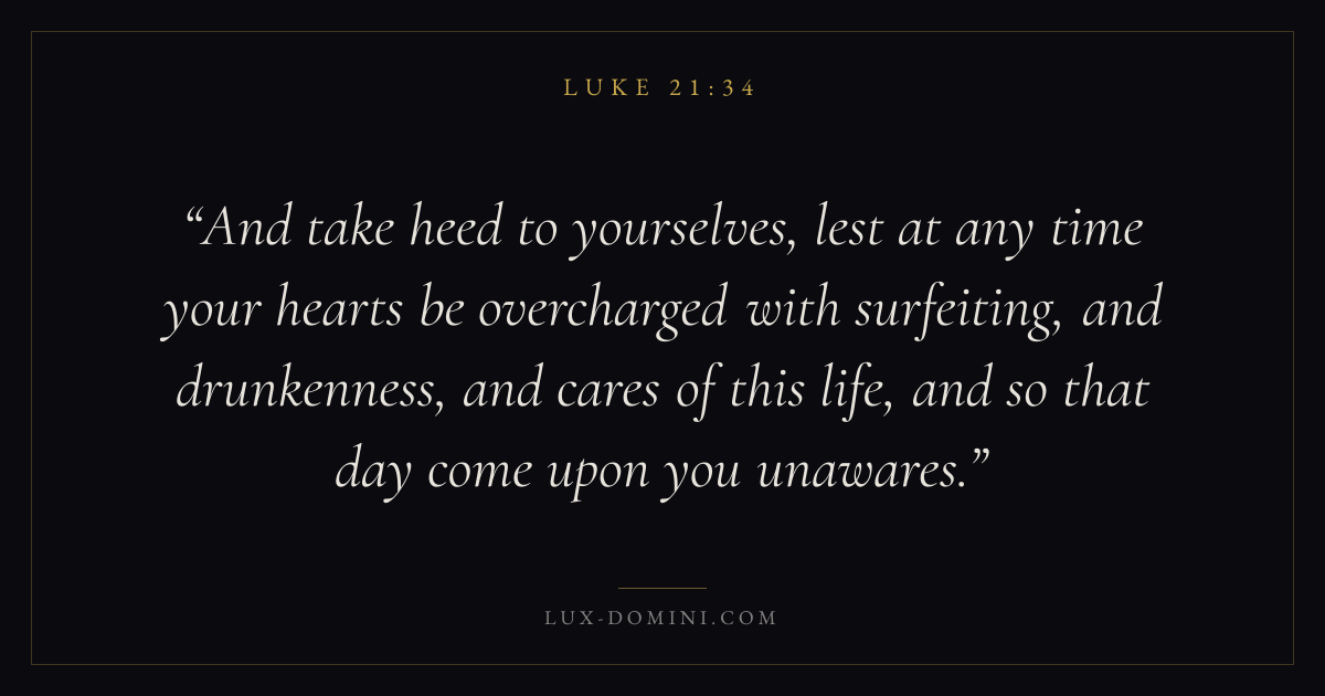 And take heed to yourselves, lest at any time your hearts be overcharged with surfeiting, and drunkenness, and cares of this life, and so that day come upon you unawares.