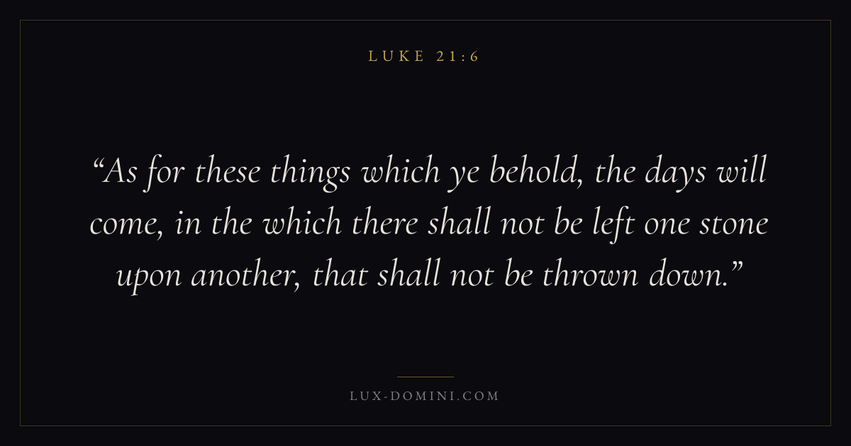 As for these things which ye behold, the days will come, in the which there shall not be left one stone upon another, that shall not be thrown down.
