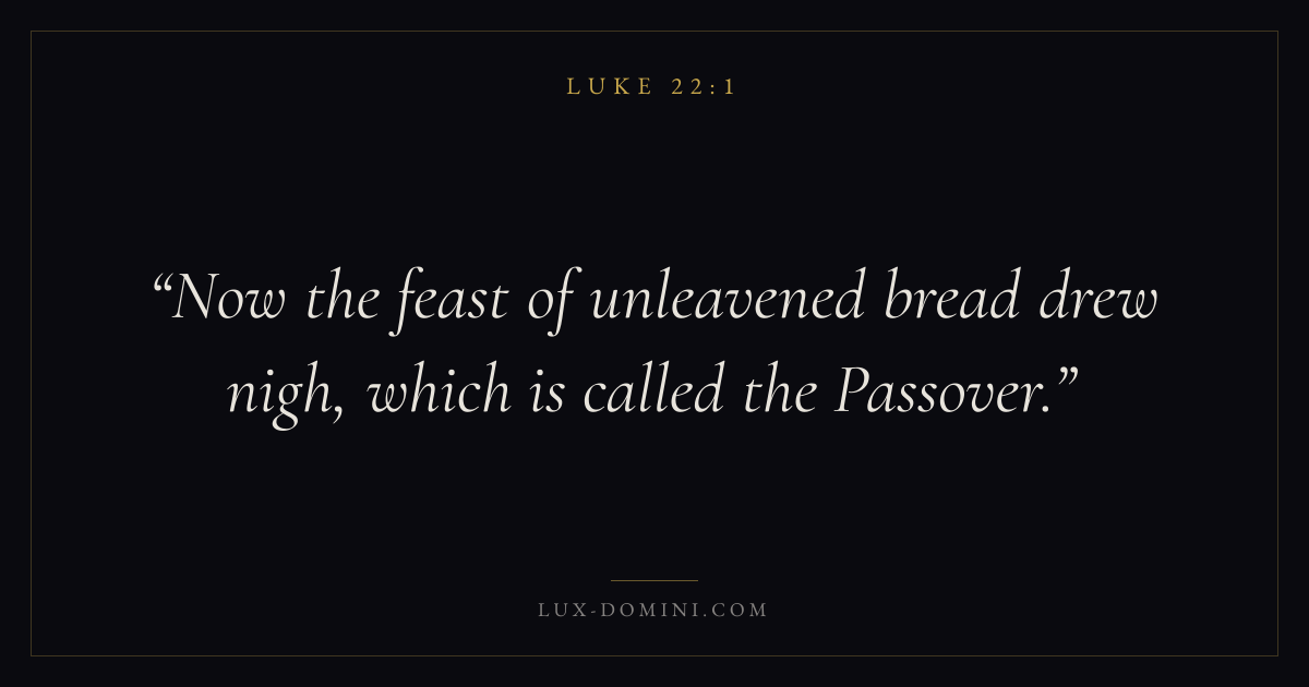 Books / Luke / Chapter 22 / Verse 1 ← Luke 21:38 Luke 22:1 Luke 22:2 → Now the feast of unleavened bread drew nigh, which is called the Passover. Download verse card Share on Twitter Share on Facebook Pin it ✦ Key themes PrayerWisdomJustice and mercySalvationSpirit Read with Luke 22:2Matthew 6:9Luke 18:1Proverbs 1:7 Related topics Bible verses about prayerBible verses about wisdomBible verses about justice and mercyBible verses about salvation ✦ Luke Chapter 22 verses V. 1 V. 2 V. 3 V. 4 V. 5 V. 6 V. 7 V. 8 V. 9 V. 10 V. 11 V. 12 V. 13 V. 14 V. 15 V. 16 V. 17 V. 18 V. 19 V. 20 V. 21 V. 22 V. 23 V. 24 V. 25 V. 26 V. 27 V. 28 V. 29 V. 30 V. 31 V. 32 V. 33 V. 34 V. 35 V. 36 V. 37 V. 38 V. 39 V. 40 V. 41 V. 42 V. 43 V. 44 V. 45 V. 46 V. 47 V. 48 V. 49 V. 50 V. 51 V. 52 V. 53 V. 54 V. 55 V. 56 V. 57 V. 58 V. 59 V. 60 V. 61 V. 62 V. 63 V. 64 V. 65 V. 66 V. 67 V. 68 V. 69 V. 70 V. 71