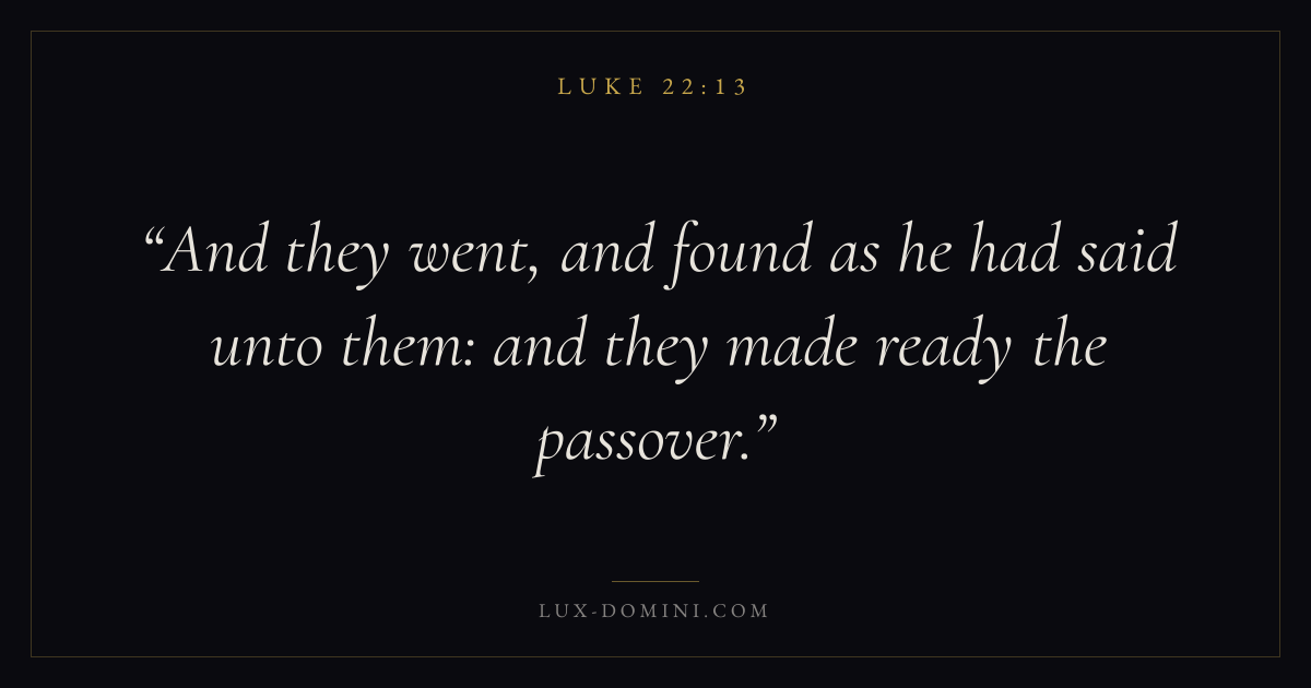 Books / Luke / Chapter 22 / Verse 13 ← Luke 22:12 Luke 22:13 Luke 22:14 → And they went, and found as he had said unto them: and they made ready the passover. Download verse card Share on Twitter Share on Facebook Pin it ✦ Key themes Anxiety and fearPrayerJustice and mercySalvationSpirit Read with Luke 22:12Luke 22:14Philippians 4:6Isaiah 41:10 Related topics Bible verses about anxiety and fearBible verses about prayerBible verses about justice and mercyBible verses about salvation ✦ Luke Chapter 22 verses V. 1 V. 2 V. 3 V. 4 V. 5 V. 6 V. 7 V. 8 V. 9 V. 10 V. 11 V. 12 V. 13 V. 14 V. 15 V. 16 V. 17 V. 18 V. 19 V. 20 V. 21 V. 22 V. 23 V. 24 V. 25 V. 26 V. 27 V. 28 V. 29 V. 30 V. 31 V. 32 V. 33 V. 34 V. 35 V. 36 V. 37 V. 38 V. 39 V. 40 V. 41 V. 42 V. 43 V. 44 V. 45 V. 46 V. 47 V. 48 V. 49 V. 50 V. 51 V. 52 V. 53 V. 54 V. 55 V. 56 V. 57 V. 58 V. 59 V. 60 V. 61 V. 62 V. 63 V. 64 V. 65 V. 66 V. 67 V. 68 V. 69 V. 70 V. 71