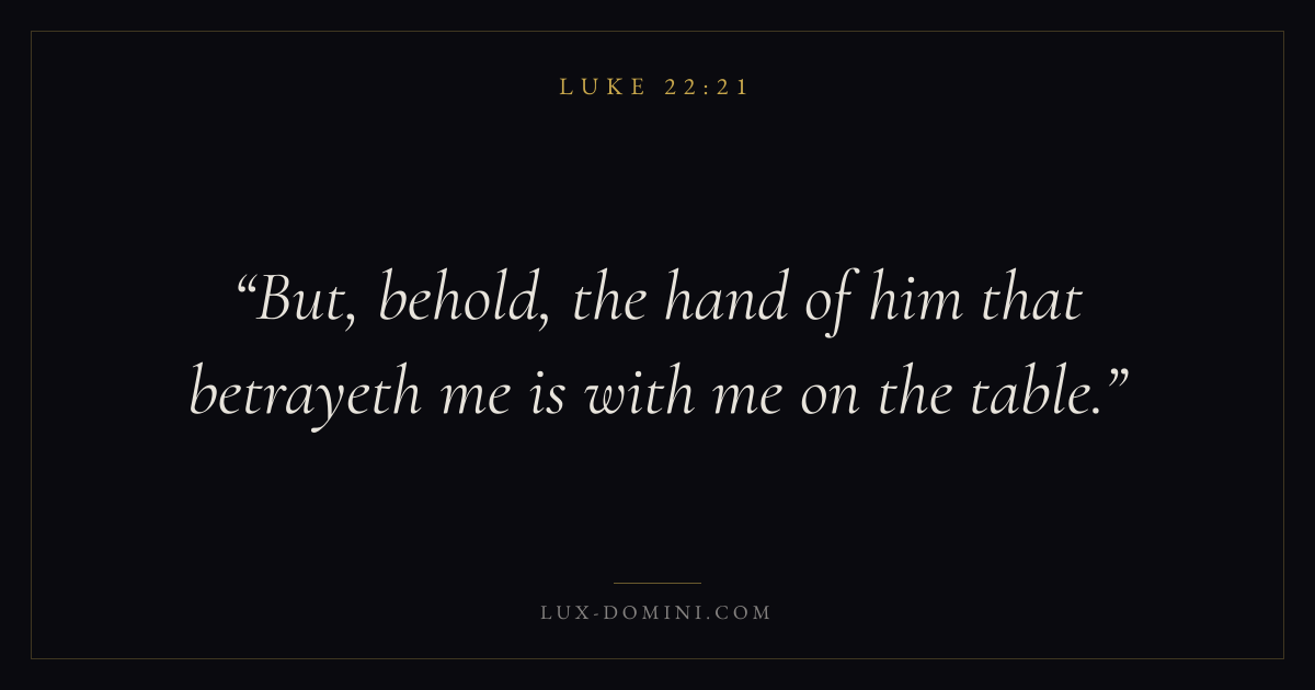 Books / Luke / Chapter 22 / Verse 21 ← Luke 22:20 Luke 22:21 Luke 22:22 → But, behold, the hand of him that betrayeth me is with me on the table. Download verse card Share on Twitter Share on Facebook Pin it ✦ Key themes PrayerJustice and mercySalvationSpirit Read with Luke 22:22Luke 22:23Matthew 6:9Luke 18:1 Related topics Bible verses about prayerBible verses about justice and mercyBible verses about salvation ✦ Luke Chapter 22 verses V. 1 V. 2 V. 3 V. 4 V. 5 V. 6 V. 7 V. 8 V. 9 V. 10 V. 11 V. 12 V. 13 V. 14 V. 15 V. 16 V. 17 V. 18 V. 19 V. 20 V. 21 V. 22 V. 23 V. 24 V. 25 V. 26 V. 27 V. 28 V. 29 V. 30 V. 31 V. 32 V. 33 V. 34 V. 35 V. 36 V. 37 V. 38 V. 39 V. 40 V. 41 V. 42 V. 43 V. 44 V. 45 V. 46 V. 47 V. 48 V. 49 V. 50 V. 51 V. 52 V. 53 V. 54 V. 55 V. 56 V. 57 V. 58 V. 59 V. 60 V. 61 V. 62 V. 63 V. 64 V. 65 V. 66 V. 67 V. 68 V. 69 V. 70 V. 71