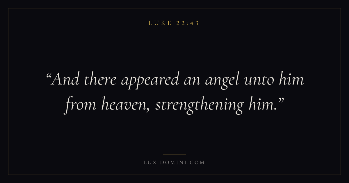 Books / Luke / Chapter 22 / Verse 43 ← Luke 22:42 Luke 22:43 Luke 22:44 → And there appeared an angel unto him from heaven, strengthening him. Download verse card Share on Twitter Share on Facebook Pin it ✦ Key themes PrayerJustice and mercySalvationHumilitySpirit Read with Luke 22:39Luke 22:40Matthew 6:9Luke 18:1 Related topics Bible verses about prayerBible verses about justice and mercyBible verses about salvationBible verses about humility ✦ Luke Chapter 22 verses V. 1 V. 2 V. 3 V. 4 V. 5 V. 6 V. 7 V. 8 V. 9 V. 10 V. 11 V. 12 V. 13 V. 14 V. 15 V. 16 V. 17 V. 18 V. 19 V. 20 V. 21 V. 22 V. 23 V. 24 V. 25 V. 26 V. 27 V. 28 V. 29 V. 30 V. 31 V. 32 V. 33 V. 34 V. 35 V. 36 V. 37 V. 38 V. 39 V. 40 V. 41 V. 42 V. 43 V. 44 V. 45 V. 46 V. 47 V. 48 V. 49 V. 50 V. 51 V. 52 V. 53 V. 54 V. 55 V. 56 V. 57 V. 58 V. 59 V. 60 V. 61 V. 62 V. 63 V. 64 V. 65 V. 66 V. 67 V. 68 V. 69 V. 70 V. 71