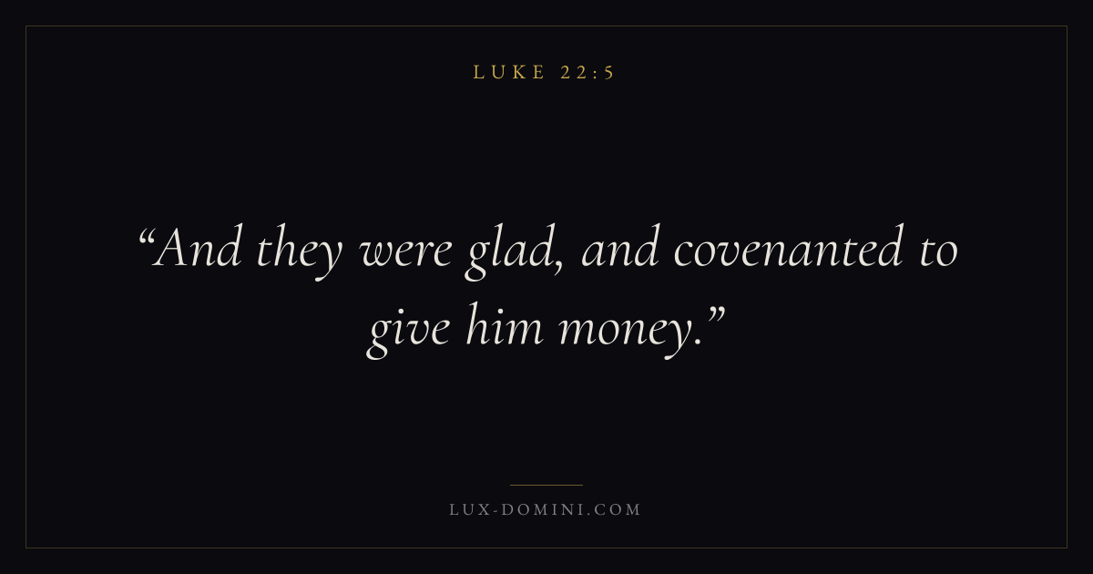 Books / Luke / Chapter 22 / Verse 5 ← Luke 22:4 Luke 22:5 Luke 22:6 → And they were glad, and covenanted to give him money. Download verse card Share on Twitter Share on Facebook Pin it ✦ Key themes PrayerWisdomJustice and mercySalvationSpirit Read with Luke 22:3Luke 22:4Matthew 6:9Luke 18:1 Related topics Bible verses about prayerBible verses about wisdomBible verses about justice and mercyBible verses about salvation ✦ Luke Chapter 22 verses V. 1 V. 2 V. 3 V. 4 V. 5 V. 6 V. 7 V. 8 V. 9 V. 10 V. 11 V. 12 V. 13 V. 14 V. 15 V. 16 V. 17 V. 18 V. 19 V. 20 V. 21 V. 22 V. 23 V. 24 V. 25 V. 26 V. 27 V. 28 V. 29 V. 30 V. 31 V. 32 V. 33 V. 34 V. 35 V. 36 V. 37 V. 38 V. 39 V. 40 V. 41 V. 42 V. 43 V. 44 V. 45 V. 46 V. 47 V. 48 V. 49 V. 50 V. 51 V. 52 V. 53 V. 54 V. 55 V. 56 V. 57 V. 58 V. 59 V. 60 V. 61 V. 62 V. 63 V. 64 V. 65 V. 66 V. 67 V. 68 V. 69 V. 70 V. 71