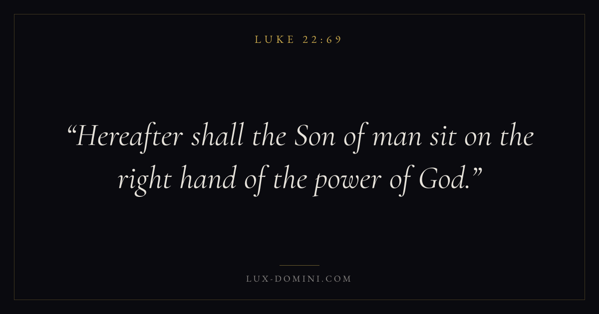 Books / Luke / Chapter 22 / Verse 69 ← Luke 22:68 Luke 22:69 Luke 22:70 → Hereafter shall the Son of man sit on the right hand of the power of God. Download verse card Share on Twitter Share on Facebook Pin it ✦ Key themes PrayerJustice and mercySalvationSpirit Read with Luke 22:70Luke 22:71Matthew 6:9Luke 18:1 Related topics Bible verses about prayerBible verses about justice and mercyBible verses about salvation ✦ Luke Chapter 22 verses V. 1 V. 2 V. 3 V. 4 V. 5 V. 6 V. 7 V. 8 V. 9 V. 10 V. 11 V. 12 V. 13 V. 14 V. 15 V. 16 V. 17 V. 18 V. 19 V. 20 V. 21 V. 22 V. 23 V. 24 V. 25 V. 26 V. 27 V. 28 V. 29 V. 30 V. 31 V. 32 V. 33 V. 34 V. 35 V. 36 V. 37 V. 38 V. 39 V. 40 V. 41 V. 42 V. 43 V. 44 V. 45 V. 46 V. 47 V. 48 V. 49 V. 50 V. 51 V. 52 V. 53 V. 54 V. 55 V. 56 V. 57 V. 58 V. 59 V. 60 V. 61 V. 62 V. 63 V. 64 V. 65 V. 66 V. 67 V. 68 V. 69 V. 70 V. 71